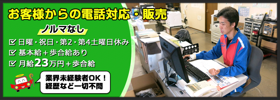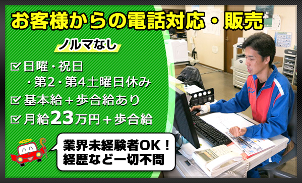 - お客様からの電話に専用ネットからリサイクルパーツの照会やアドバイスをするお仕事です。お客様が希望してるリサイクルパーツを専用ネット(全国約200拠点)でお探しし、提供することで満足・お得感で喜んで頂けますよ。もし現時点でお探しできなかった物も引き続きお探しして、より多くのお客様に提供するようにします。20代から30代、40代、50代まで、リサイクルパーツ販売スタッフのプロとして活躍しています。