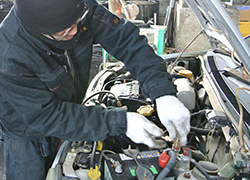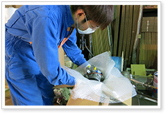 - 使用済み車両から、使える部品を取り外し、検査やテストを行います。国内・国外で利用価値のあるものは、ネジひとつまで選別します。